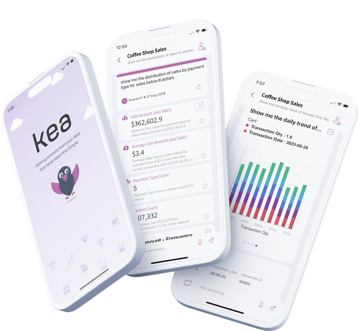 A typical human conversation flows like this: you greet, ask questions, get answers, and follow up, all in simple, everyday language. Well, that’s exactly how Kea works, but instead of talking to a person, you’re talking to your data. Whether you’re on the road, in a critical meeting, or deeply researching at your desk, it can be accessed anywhere, any time you want.